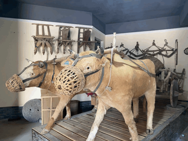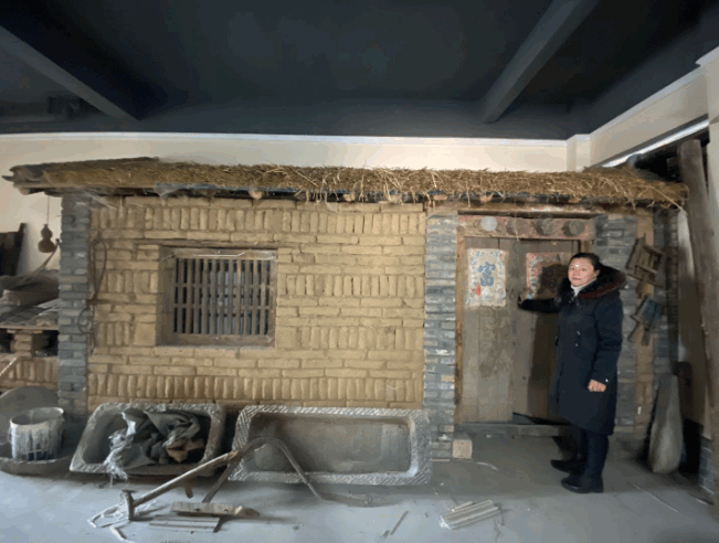 在老式农村厨房场景中,一个砖砌的锅台,两口铸铁锅,一台风箱,老式木拍子,蒸笼,水缸,水桶,火钳,箅子……过去人家的一日三餐,就是在这样的厨房里做成。老式客厅里,放着条案,八仙桌,太师椅,挂着《益寿延年》画;卧室场景里,放着一张清代雕花顶子床,还有放衣服的木箱,小木桌、小木椅、老座钟等。刘国方还特意从外地买来了“牛”“驴”“鸡”等造型,于是有了戴着牛笼嘴的“黄牛”拉着牛车、“小毛驴”拉着石磨等场景。在一楼的一角,甚至修了一座茅屋,草房顶、土坯墙,门是极有年代感的老式旧木门,茅屋一侧,还修了一个小型鸡舍……一个个场景,原汁原味地反映出传统农耕生产生活风貌,让人嗅到了岁月以原生态形式散发出的往日气息。